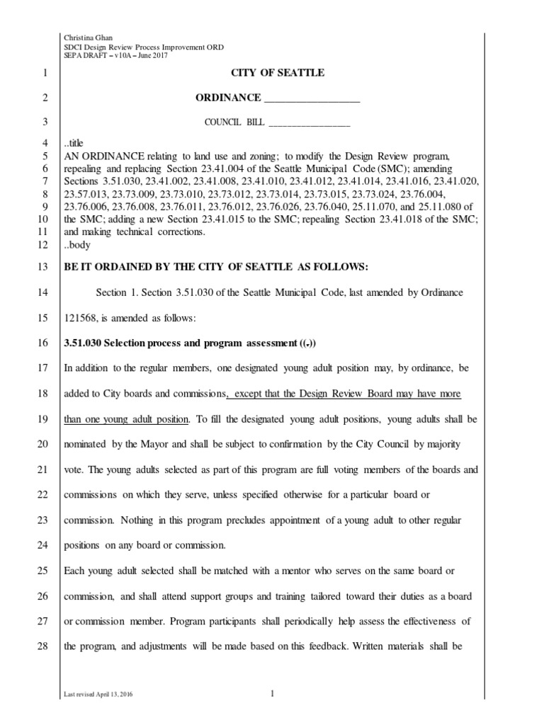 3 ..title 4 AN ORDINANCE relating to land use and zoning; to modify the Design Review program, 5 repealing and replacing Section 23.41.004 of the Seattle Municipal Code (SMC); amending 6 Sections 3.51.030, 23.41.002, 23.41.008, 23.41.010, 23.41.012, 23.41.014, 23.41.016, 23.41.020, 7 23.57.013, 23.73.009, 23.73.010, 23.73.012, 23.73.014, 23.73.015, 23.73.024, 23.76.004, 8 23.76.006, 23.76.008, 23.76.011, 23.76.012, 23.76.026, 23.76.040, 25.11.070, and 25.11.080 of 9 the SMC; adding a new Section 23.41.015 to the SMC; repealing Section 23.41.018 of the SMC; 10 and making technical corrections. 11 ..body 12