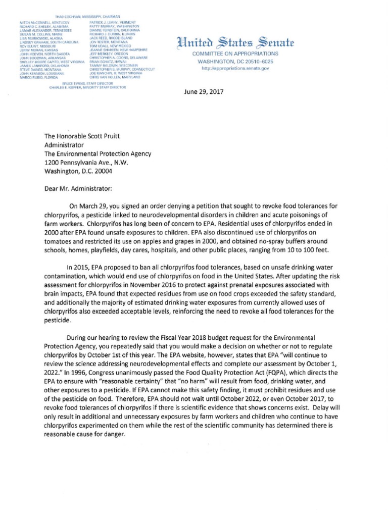 WASHINGTON — Today, U.S. Senator Tom Udall (D-N.M.), ranking member of the Senate Appropriations subcommittee that oversees the Environmental Protection Agency (EPA)’s budget, sent a letter to EPA Administrator Scott Pruitt demanding answers about his March 29 decision to reject a petition that sought to ban chlorpyrifos, a pesticide associated with neurodevelopmental disorders in children and acute poisonings of farm workers. In denying the petition, Pruitt reversed the EPA’s proposed ban on the use of chlorpyrifos on food crops — and rejected the scientific determination of EPA’s professional staff linking chlorpyrifos to brain damage and farmer and bystander poisoning.