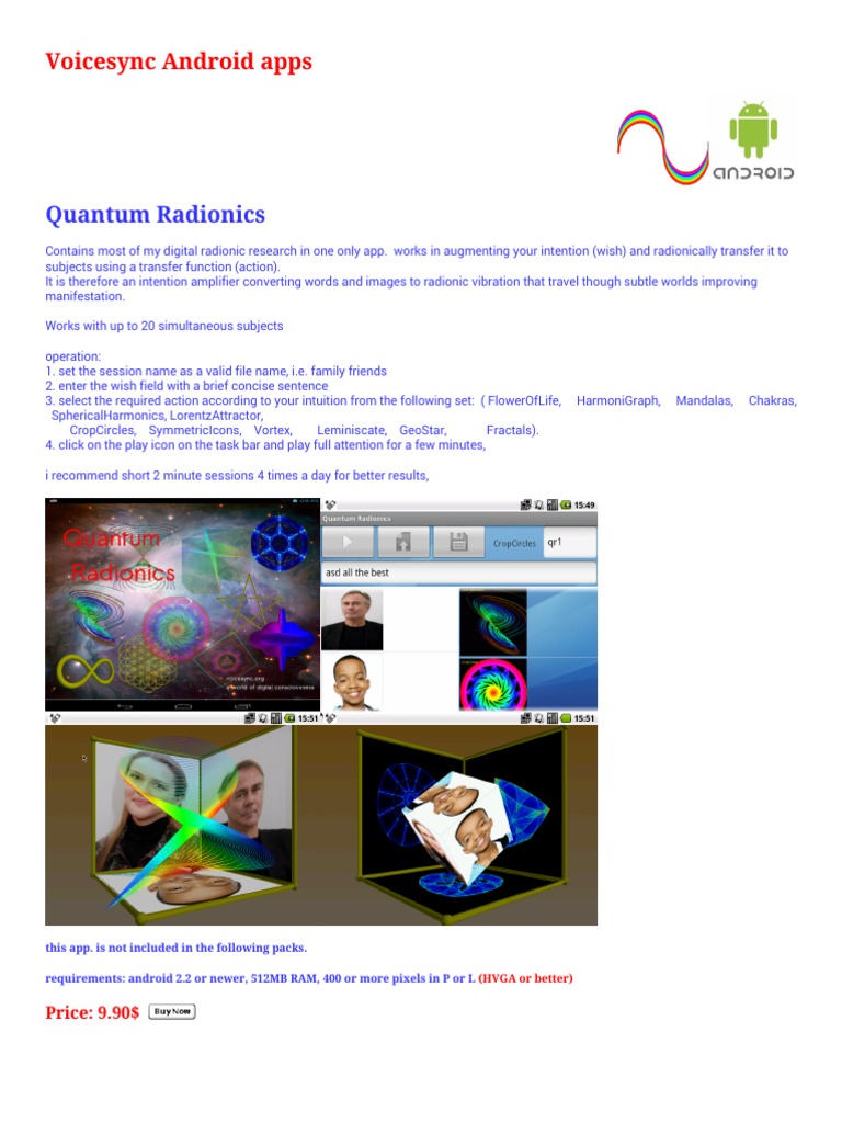 Contains most of my digital radionic research in one only app. works in augmenting your intention (wish) and radionically transfer it to