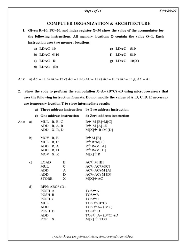 1. Given R=10, PC=20, and index register X=30 show the value of the accumulator for