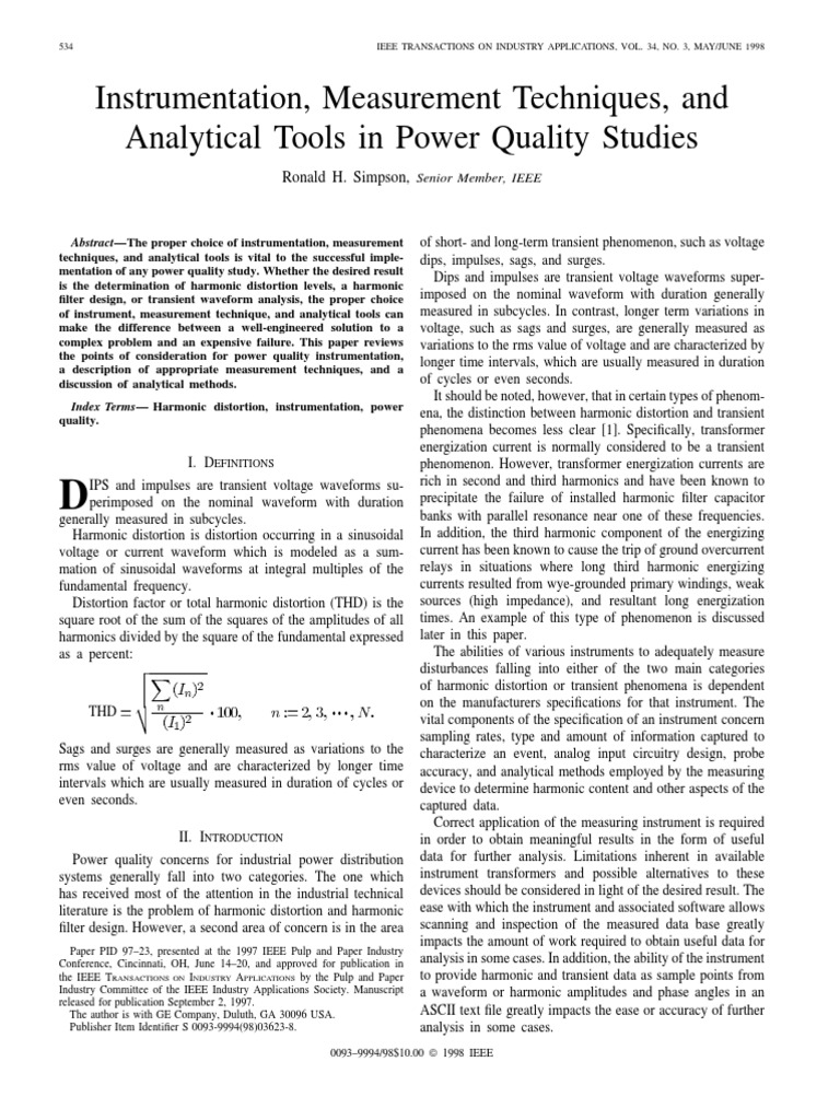 the IEEE TRANSACTIONS ON INDUSTRY APPLICATIONS by the Pulp and Paper to provide harmonic and transient data as sample points from