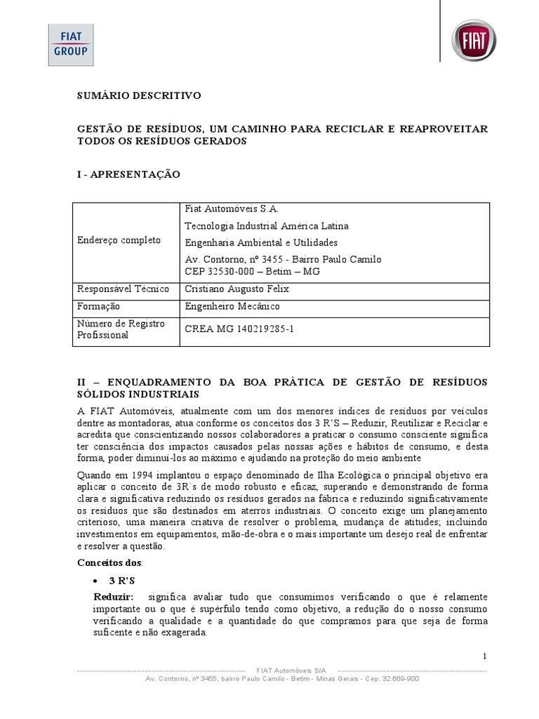 dos resduos, destacar-se que atualmente 98,2% dos resduos gerados na FIAT Automveis