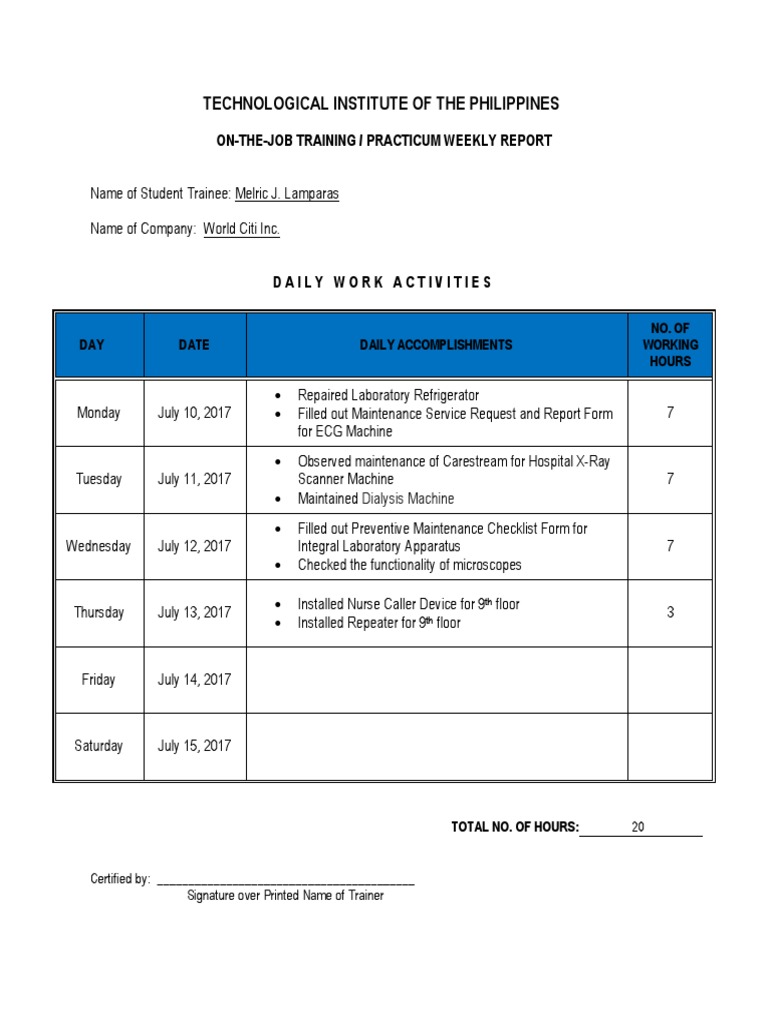 ON-THE-JOB TRAINING / PRACTICUM WEEKLY REPORT