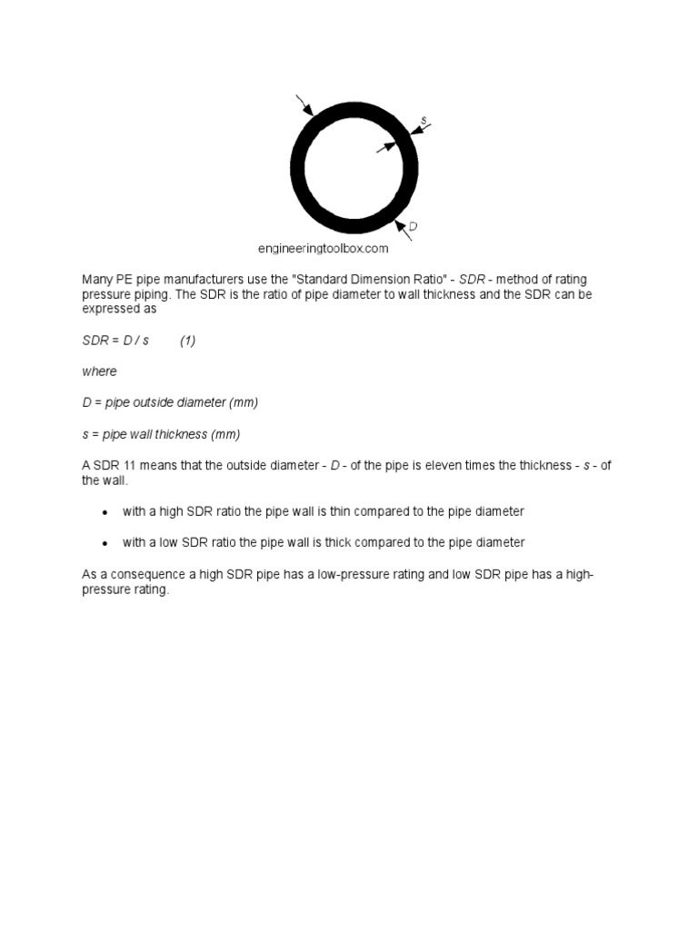 pressure piping. The SDR is the ratio of pipe diameter to wall thickness and the SDR can be