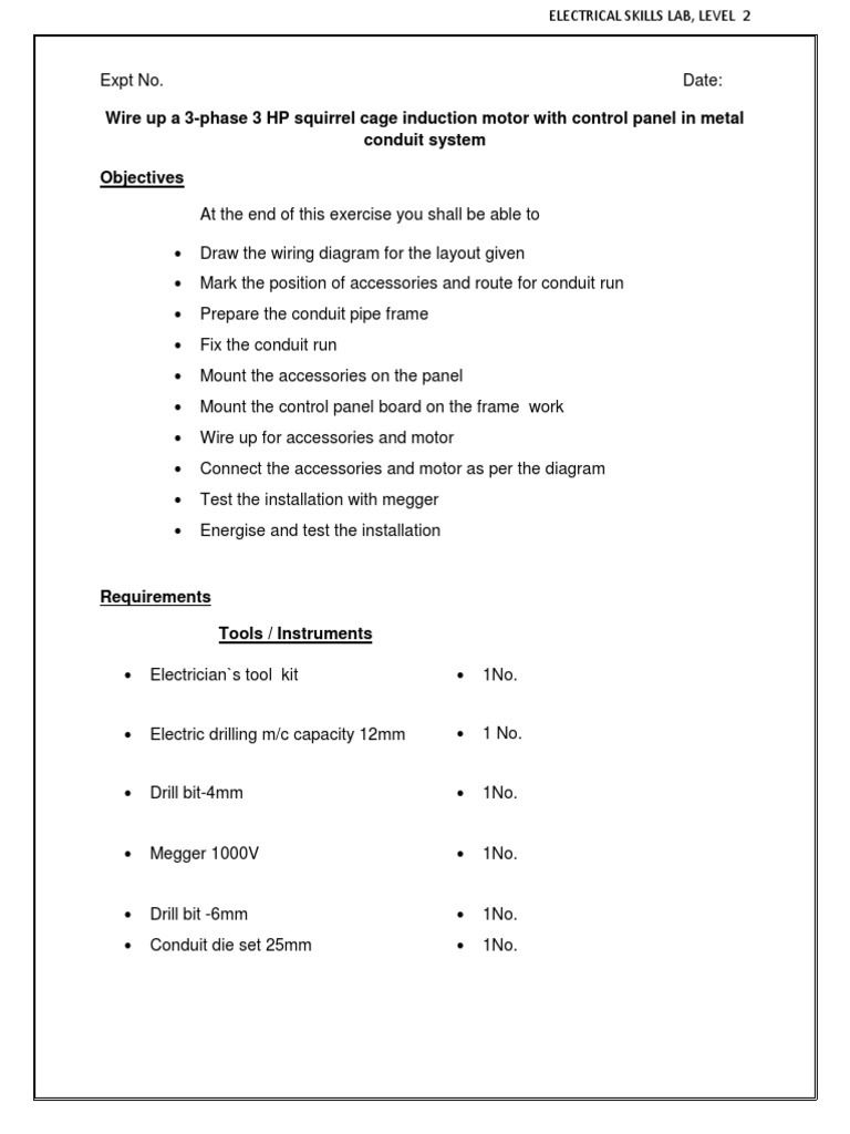 Wire up a 3-phase 3 HP squirrel cage induction motor with control panel in metal