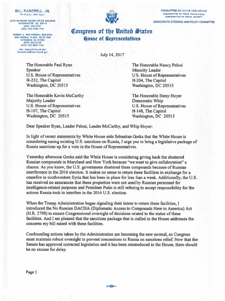 WASHINGTON, D.C. – U.S. Representative Bill Pascrell, Jr. (NJ-09) called on the leadership in the House of Representatives today to bring a legislative package of Russia sanctions up for a vote in light of remarks yesterday by White House aide Sebastian Gorka that indicated the Trump Administration is preparing to return shuttered Russian compounds. The legislative package of Russia sanctions, which passed the Senate 98-2 nearly one month ago, has not been brought to the floor of the House of Representatives because of process delays. The concerns which prompted these delays were addressed by the Senate, which made changes and promptly sent back to the House of Representatives. House Democrats even introduced a version (H.R. 3203) of the Senate passed legislation which resolved the procedural concerns that have delayed House action on the sanctions package.