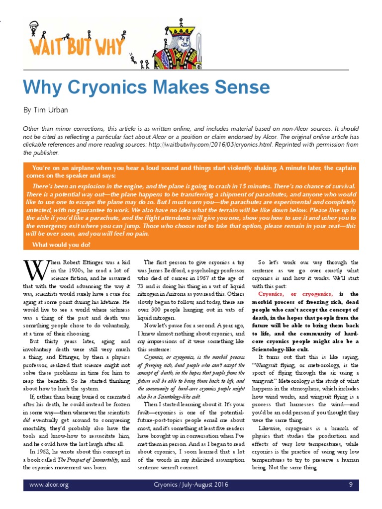 Other than minor corrections, this article is as written online, and includes material based on non-Alcor sources. It should not be cited as reflecting a particular fact about Alcor or a position or claim endorsed by Alcor. The original online article has clickable references and more reading sources: http://waitbutwhy.com/2016/03/cryonics.html. Reprinted with permission from the publisher.