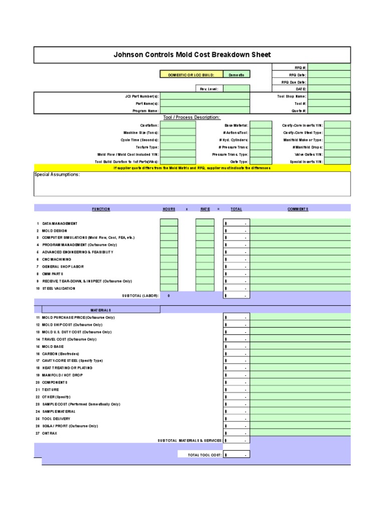Johnson Controls Mold Cost Breakdown Sheet