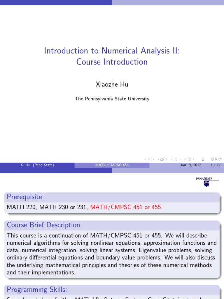 X. Hu (Penn State) MATH/CMPSC 456 Jan. 9, 2012 2 / 11