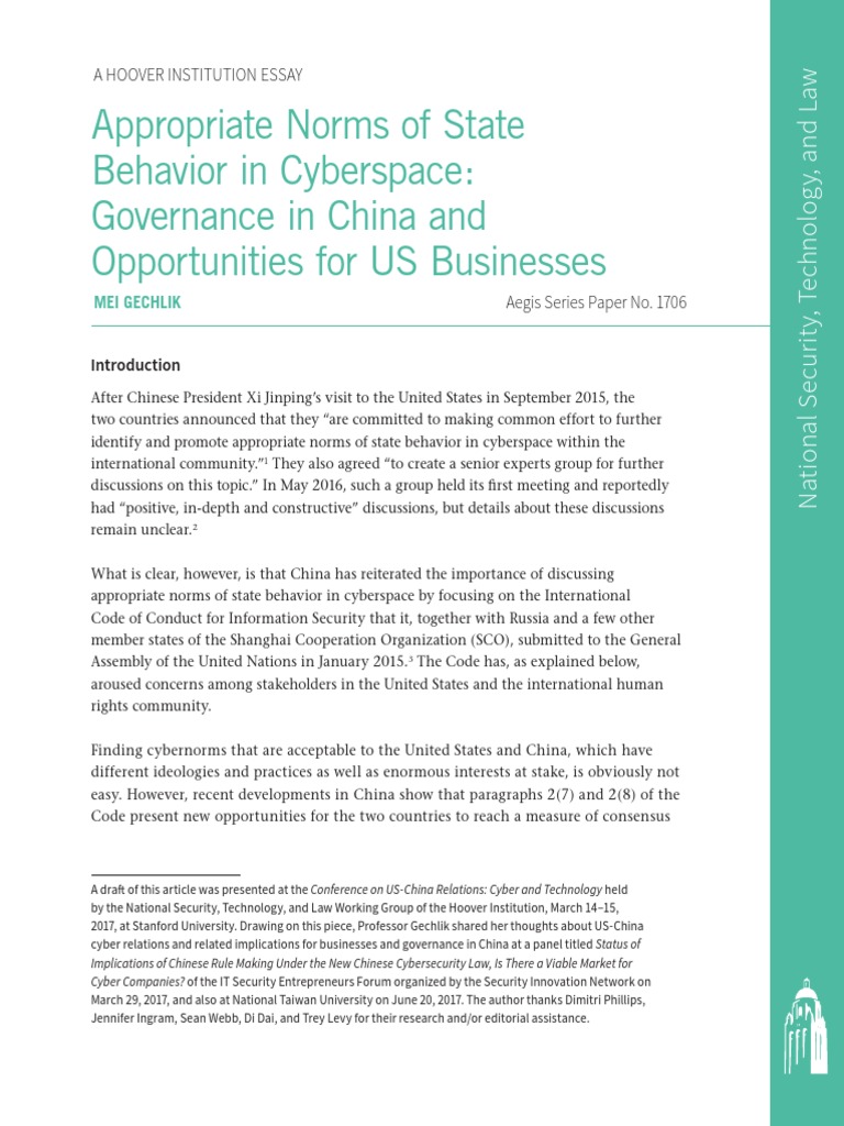 Mei Gechlik • Appropriate Norms of State Behavior in Cyberspace: Governance in China and Opportunities for US Businesses