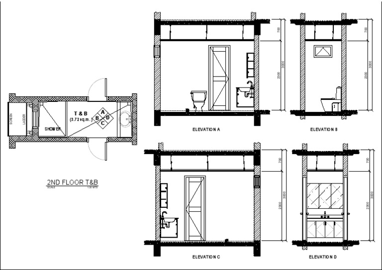 This architectural drawing shows elevations for a 2nd floor bathroom. Elevation A shows a 700mm wide door and 700mm deep shower area. Elevation B shows a 3,000mm long wall with a 2,300mm deep toilet and basin area. Elevation C again shows the 3,000mm long wall and Elevation D repeats the dimensions from Elevation A.