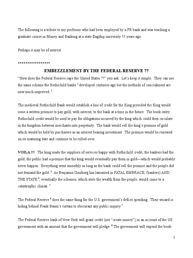 This document discusses how the Federal Reserve embezzles from the United States through deficit spending. It argues that the Federal Reserve uses the same scheme as medieval Rothschild banks, granting credit to the government and selling promises of future payment, while hiding where the funds from these transactions actually go. The document speculates that profits from deficit spending are funneled to shareholders of the Federal Reserve's Board of Governors, constituting embezzlement. It warns that accumulating debt could reduce the US to the status seen in Greece.