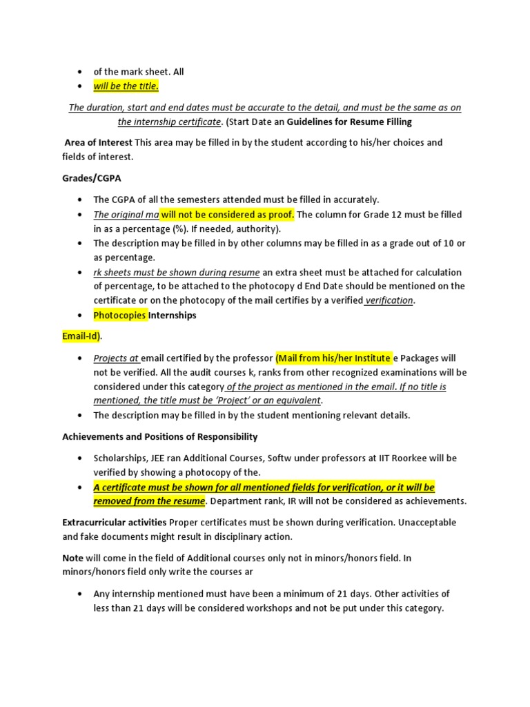 removed from the resume. Department rank, IR will not be considered as achievements.