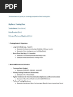 This document outlines a forex trading journal template with 7 key fields to log: 1) Trading strategy, 2) Whether the trade is long or short, 3) The entry price, 4) Stop loss price, 5) Profit target price, 6) Trade result, 7) Reason for entering the trade. The template helps forex traders systematically track their past trades for learning and improving future trading decisions.