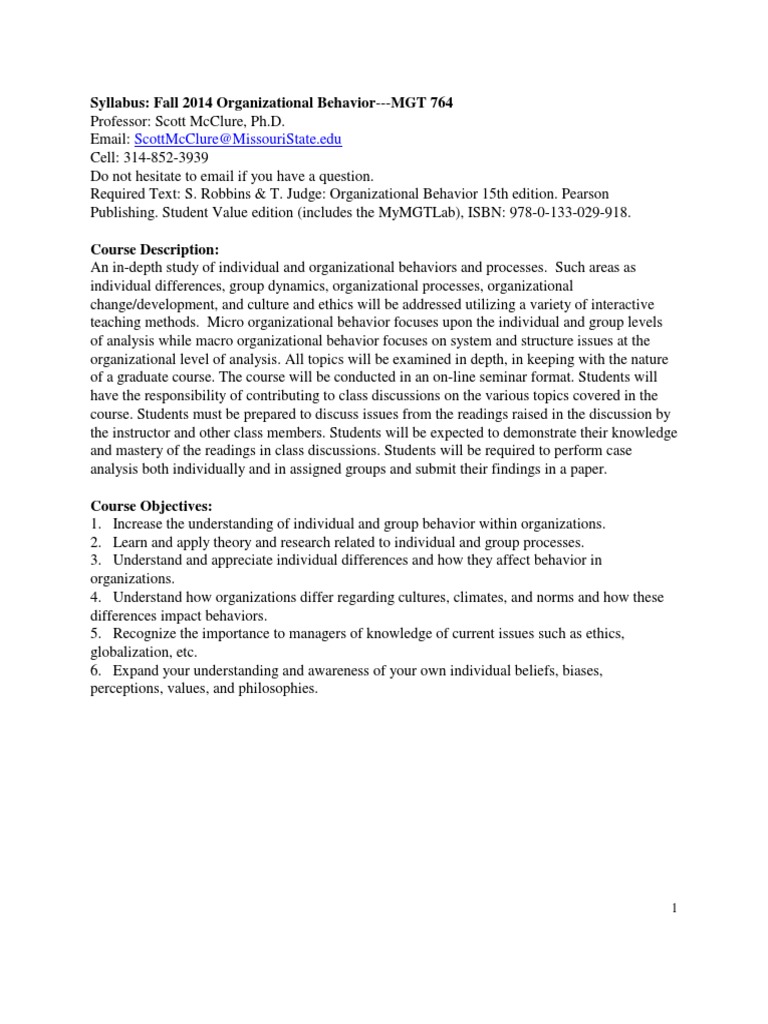 Syllabus: Fall 2014 Organizational Behavior---MGT 764