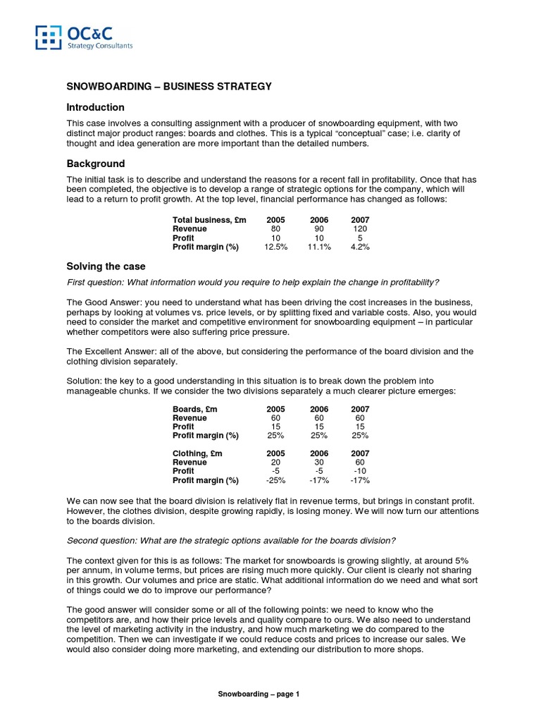 This case involves a consulting assignment with a producer of snowboarding equipment, with two