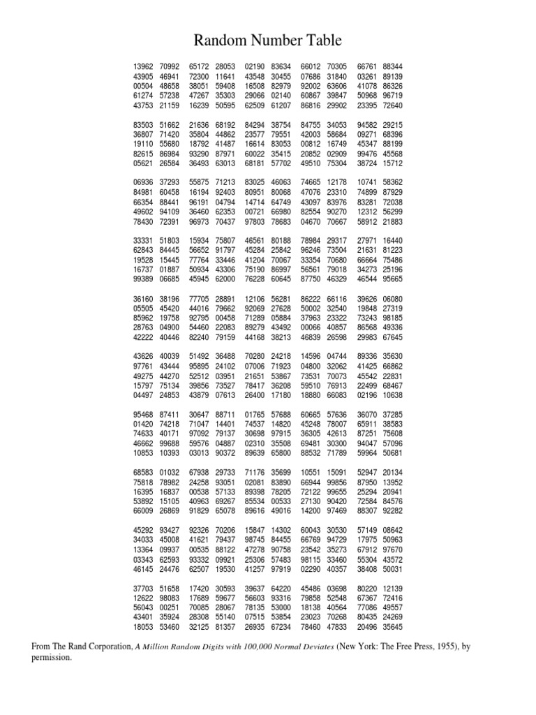 From The Rand Corporation, A Million Random Digits with 100,000 Normal Deviates (New York: The Free Press, 1955), by