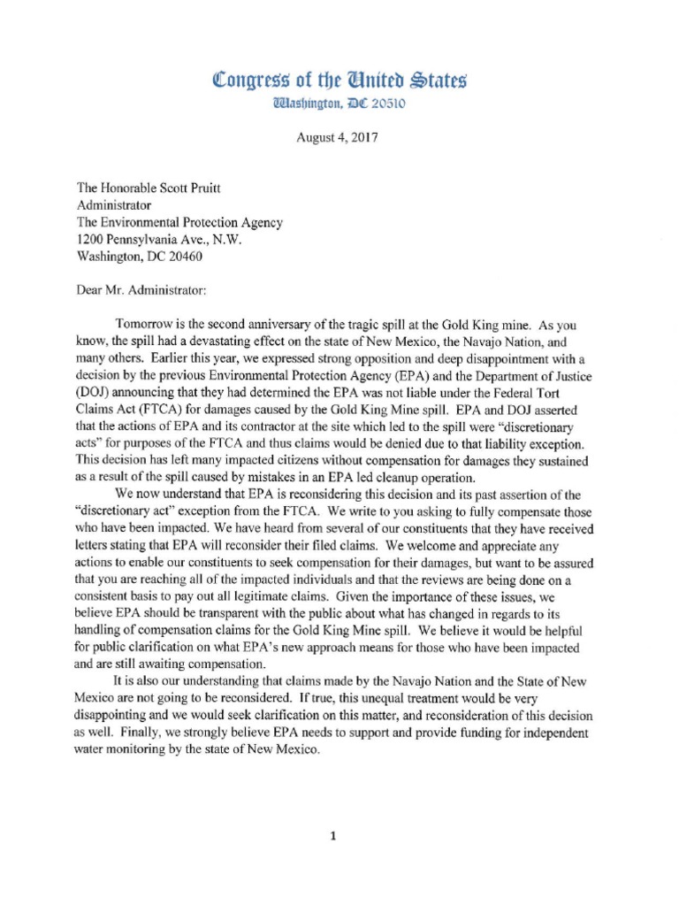 WASHINGTON -- Today, following the announcement that Environmental Protection Agency (EPA) Administrator Scott Pruitt has reconsidered an EPA decision and will allow victims of the Gold King Mine spill to file for compensation, all five members of the New Mexico congressional delegation wrote Pruitt a letter, asking him to treat all claimants equally and clearly explain what this announcement means for those who suffered damages.