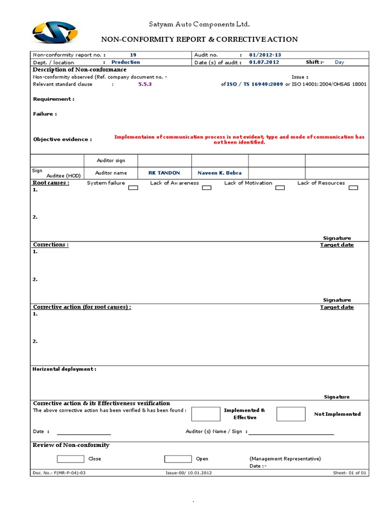 Non-conformity report no. : 19 Audit no. : 01/2012-13