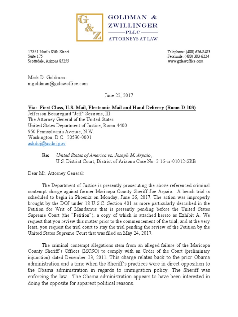 Dear Mr. Attorney General: The Department of Justice is presently prosecuting the above referenced criminal contempt charge against former Maricopa County Sheriff Joe Arpaio. A bench trial is scheduled to begin in Phoenix on Monday, June 26, 2017. The action was improperly brought by the DOJ under 18 U.S.C. Section 401 as more particularly described in the Petition for Writ of Mandamus that is presently pending before the United States Supreme Court (the “Petition”), a copy of which is attached hereto as Exhibit A. We request that you review this matter prior to the commencement of the trial, and at the very least, you request the trial court to stay the trial pending the review of the Petition by the United States Supreme Court that was filed on May 24, 2017. The criminal contempt allegations stem from an alleged failure of the Maricopa County Sheriff’s Offices (MCSO) to comply with an Order of the Court (preliminary injunction) dated December 23, 2011