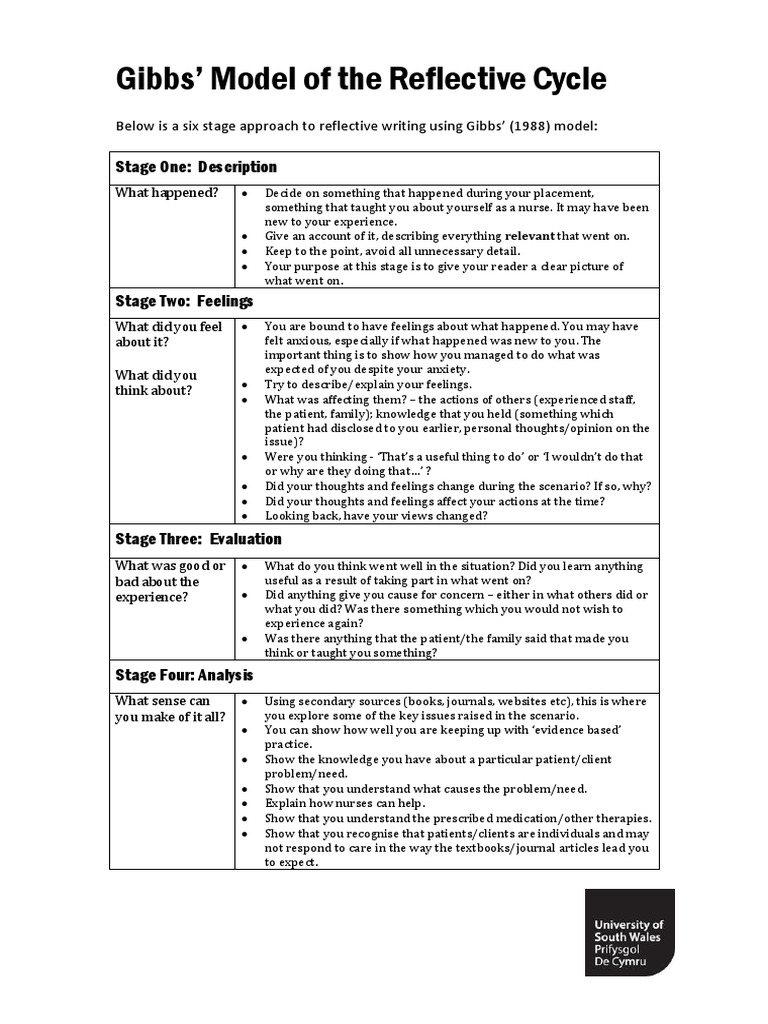 Below is a six stage approach to reflective writing using Gibbs (1988) model: