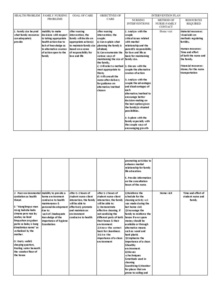HEALTH PROBLEM FAMILY NURSING GOAL OF CARE OBJECTIVES OF INTERVENTION PLAN