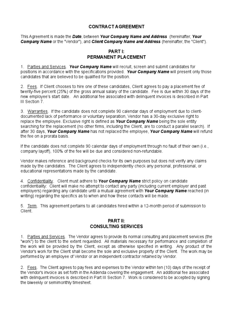 1. Parties and Services. Your Company Name will recruit, screen and submit candidates for