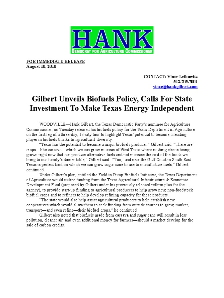 WOODVILLE—Hank Gilbert, the Texas Democratic Party’s nominee for AgricultureCommissioner, on Tuesday released his biofuels policy for the Texas Department of Agricultureon the first leg of a three-day, 13-city tour to highlight Texas’ potential to become a leading player in biofuels thanks to agricultural diversity.“Texas has the potential to become a major biofuels producer,” Gilbert said. “There arecrops—like cassava—which we can grow in areas of West Texas where nothing else is beinggrown right now that can produce alternative fuels and not increase the cost of the foods we bring to our family’s dinner table,” Gilbert said. “Too, land near the Gulf Coast in South EastTexas is perfect land on which we can grow sugar cane to use to manufacture fuels,” Gilbertcontinued.Under Gilbert’s plan, entitled the Field to Pump Biofuels Initiative, the Texas Departmentof Agriculture would utilize funding from the Texas Agricultural Infrastructure & EconomicDevelopment Fund (proposed by Gilbert under his previously released reform plan for theagency), to provide start-up funding to agricultural producers to help grow new, non-foodstock biofuel crops and to refiners to help develop refining capacity for those products.“The state would also help assist agricultural producers to help establish newcooperatives which would allow them to seek funding from outside sources to grow, market,transport—and even refine—their biofuel crops,” he continued.Gilbert also noted that biofuels made from cassava and sugar cane will result in less pollution, cleaner air, and even additional money for farmers—should a market develop for thesale of carbon credits.