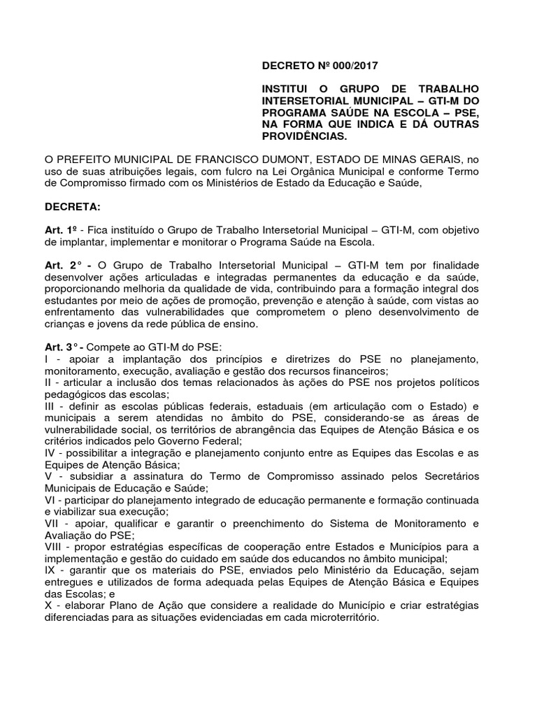 O PREFEITO MUNICIPAL DE FRANCISCO DUMONT, ESTADO DE MINAS GERAIS, no