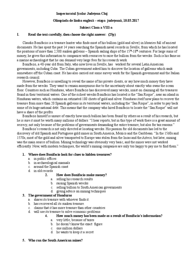 I. Reading comprehension: 5x 5p/correct answer- 25 p