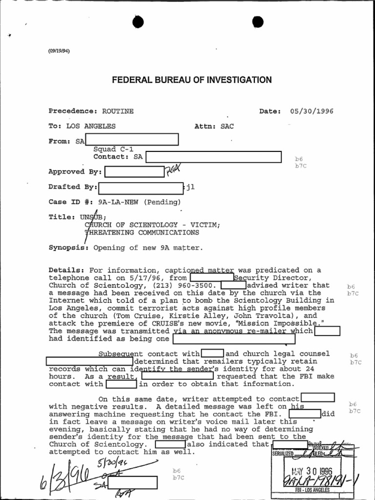 For information of Miami, captioned case was predicated upon a complaint from Security Director of the CHURCH OF SCIENTOLOGY, Los Angeles, regarding an anonymous threat that had been received, via the Internet, by the church on 5/17/96. The message was sent by way of a "re-mailer" which is designed to mask the identity of the actual sender. The message told of a plan to bomb the SCIENTOLOGY Building in Los Angeles, commit