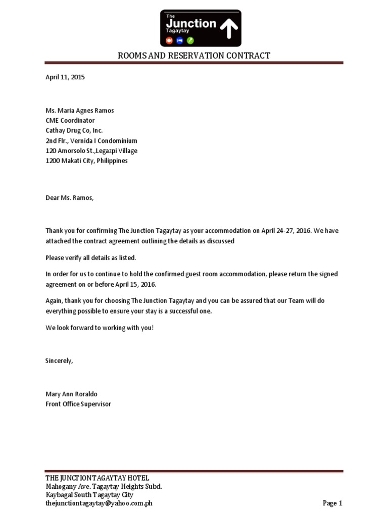 Thank you for confirming The Junction Tagaytay as your accommodation on April 24-27, 2016. We have