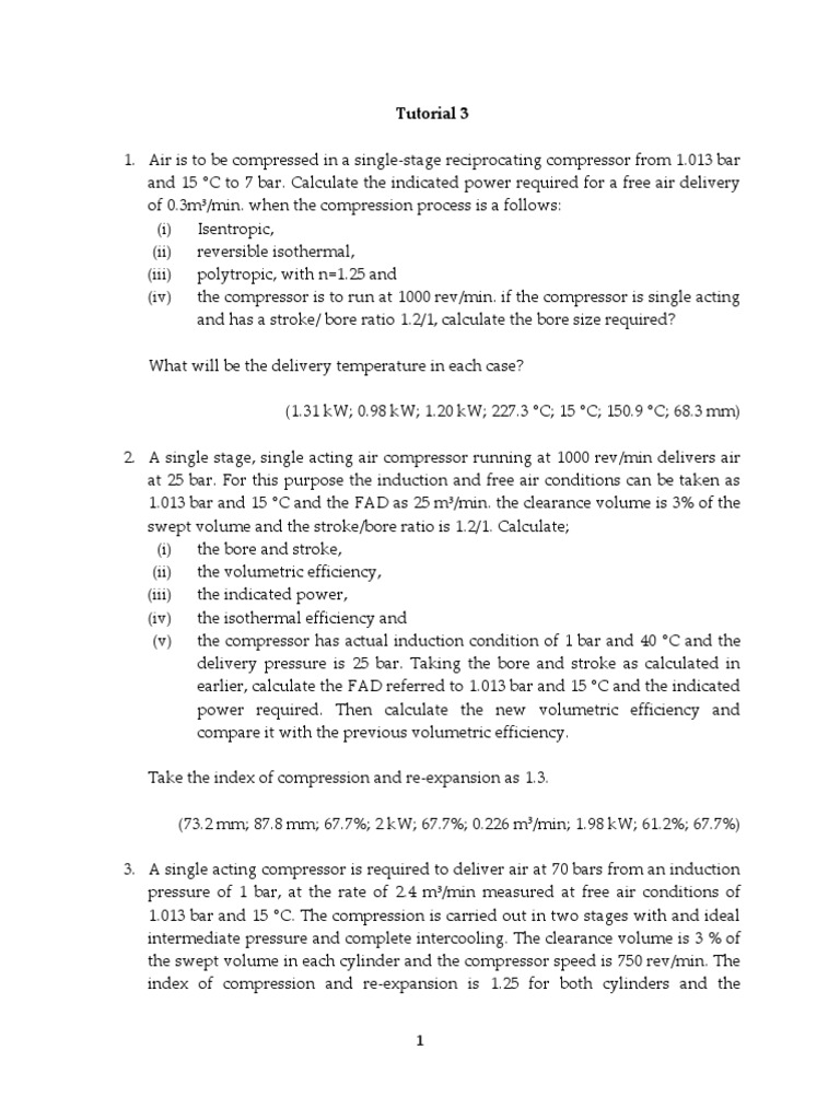 1. Air is to be compressed in a single-stage reciprocating compressor from 1.013 bar