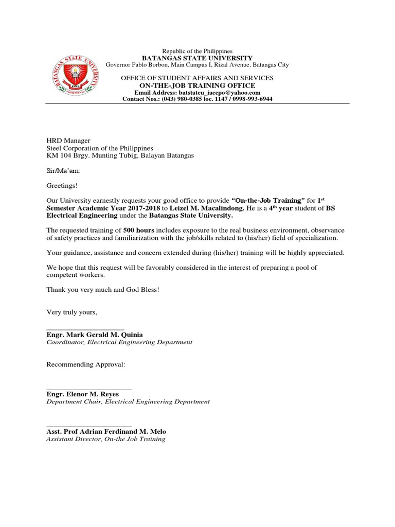 Our University earnestly requests your good office to provide On-the-Job Training for 1st