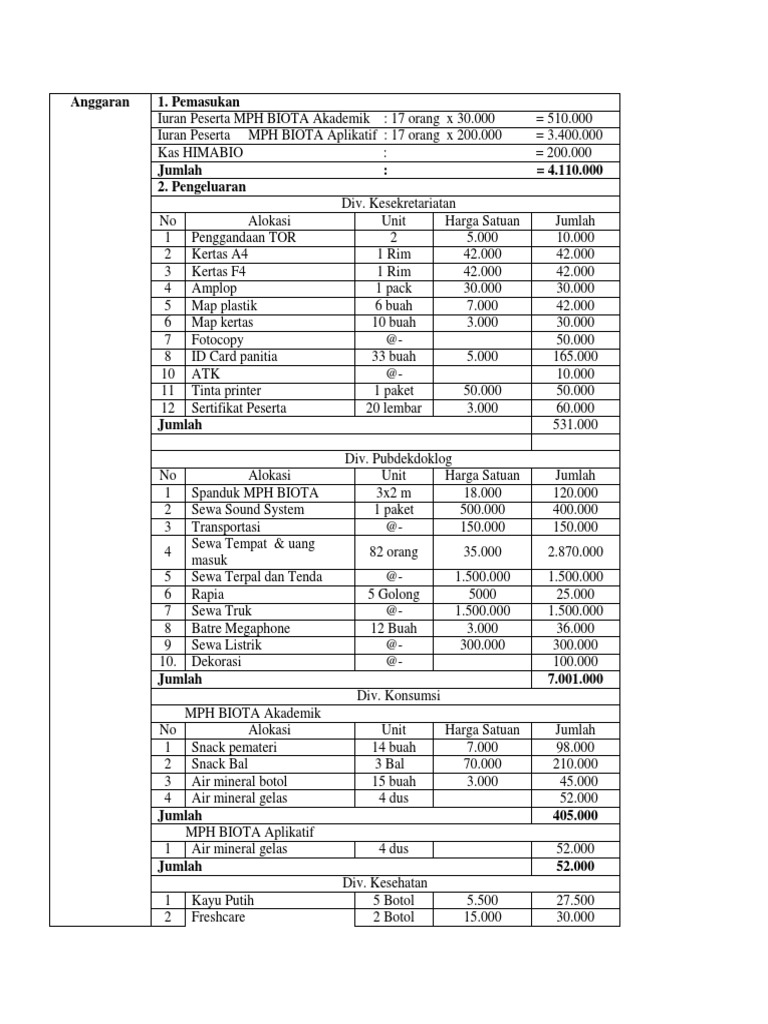 No Alokasi Unit Harga Satuan Jumlah