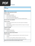 This project diary template is used to log weekly progress on a project. It collects the project title, date, work completed that week, any problems encountered, planned work for the following week, status of the project plan, and space for supervisor comments and signature.