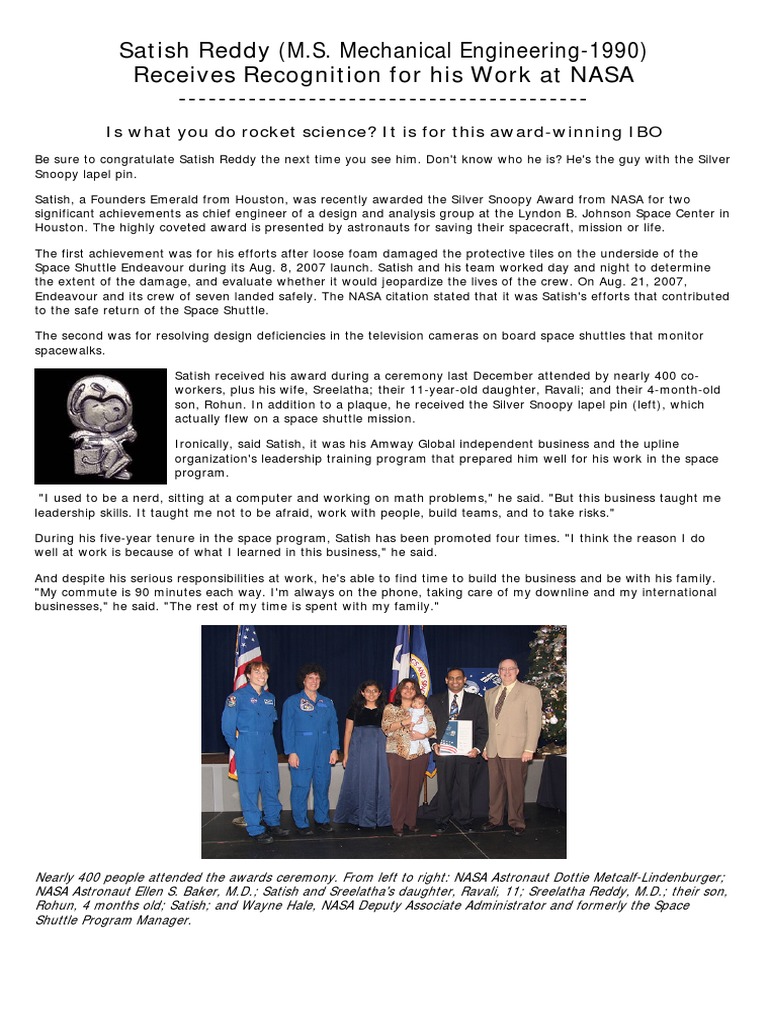 Satish, a Founders Emerald from Houston, was recently awarded the Silver Snoopy Award from NASA for two