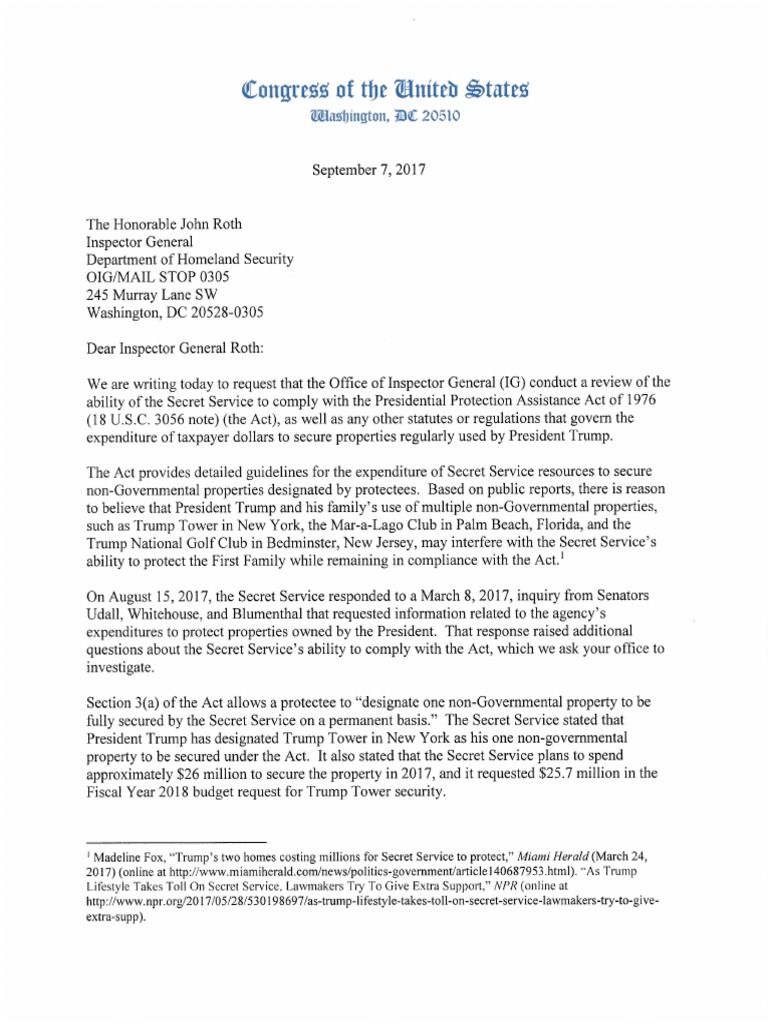 WASHINGTON — U.S. Senators Tom Udall (D-N.M.), Richard Blumenthal (D-Conn.), Sheldon Whitehouse (D-R.I.) and Gary Peters (D-Mich.) and U.S. Representative Elijah Cummings (D-Md.), ranking member of the House Committee on Oversight and Government Reform, questioned whether the U.S. Secret Service (USSS) can comply with federal law and congressionally mandated spending limits when the agency uses millions of taxpayer dollars to protect President Trump’s multiple properties, including Trump Tower in New York, the Mar-a-Lago Club in Palm Beach, Fla., and the Trump National Golf Club in Bedminster, N.J.