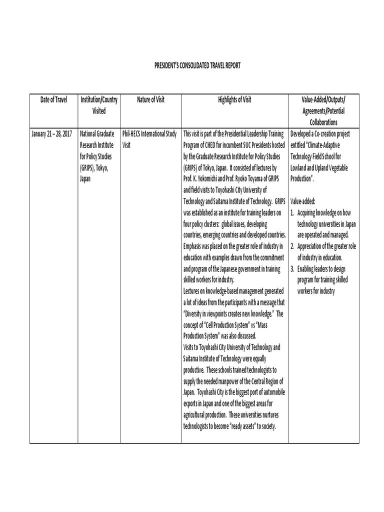 January 21 28, 2017 National Graduate Phil-HECS International Study This visit is part of the Presidential Leadership Training Developed a Co-creation project