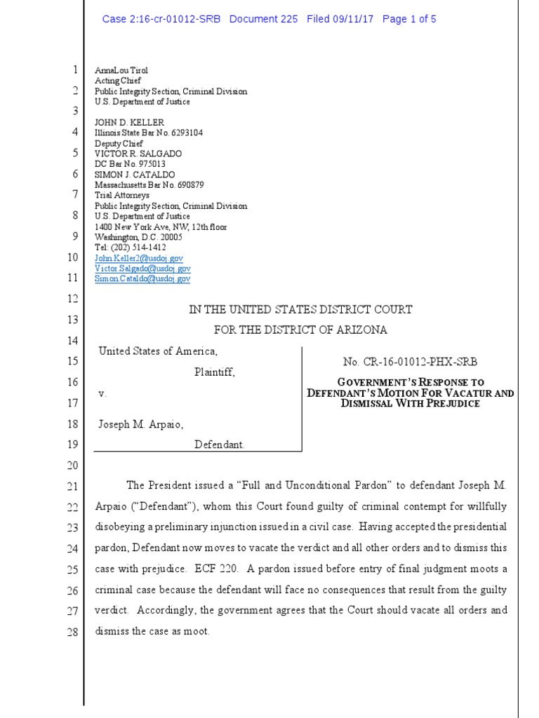The President issued a “Full and Unconditional Pardon” to defendant Joseph M. Arpaio (“Defendant”), whom this Court found guilty of criminal contempt for willfully disobeying a preliminary injunction issued in a civil case. Having accepted the presidential pardon, Defendant now moves to vacate the verdict and all other orders and to dismiss this case with prejudice. ECF 220. A pardon issued before entry of final judgment moots a criminal case because the defendant will face no consequences that result from the guilty verdict. Accordingly, the government agrees that the Court should vacate all orders and dismiss the case as moot.