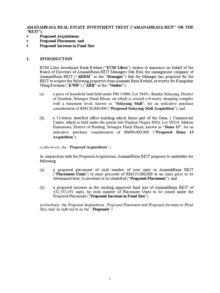In conjunction with the Proposed Acquisitions, AmanahRaya REIT proposes to undertake the