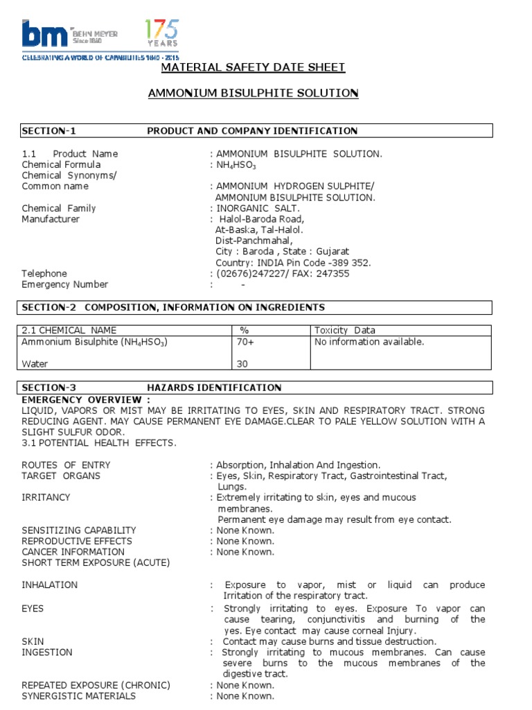 1.1 Product Name : AMMONIUM BISULPHITE SOLUTION.