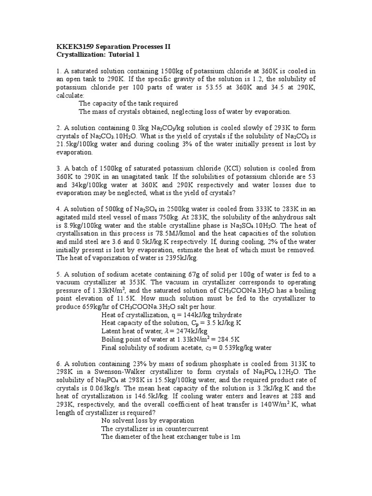 1. A saturated solution containing 1500kg of potassium chloride at 360K is cooled in