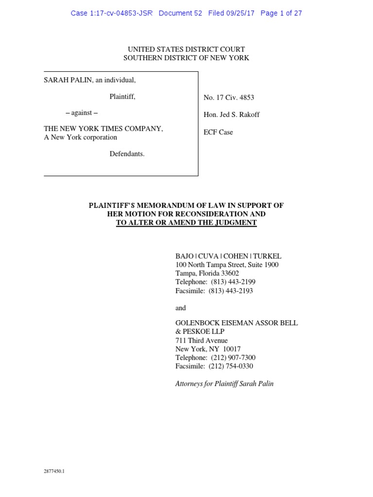 This document is Plaintiff Sarah Palin's memorandum in support of her motion for reconsideration and to alter or amend the judgment dismissing her defamation lawsuit against The New York Tim…