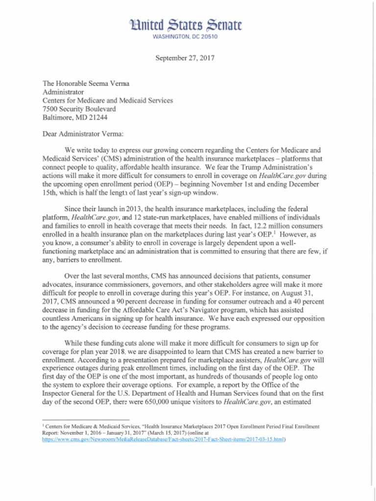 17.9.27._Booker-Schatz-Murphy-Warren Letter to CMS Re HealthCare.gov
