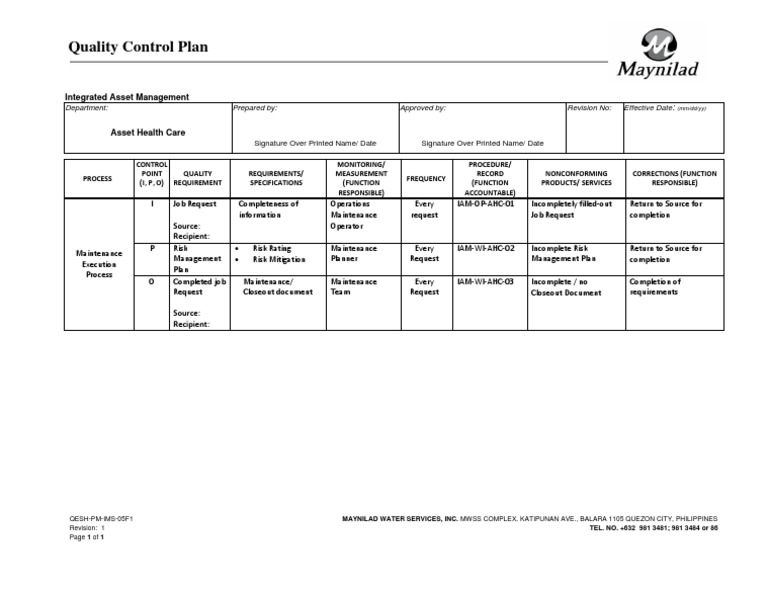 QESH-PM-IMS-05F1 MAYNILAD WATER SERVICES, INC. MWSS COMPLEX, KATIPUNAN AVE., BALARA 1105 QUEZON CITY, PHILIPPINES