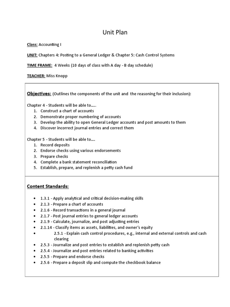 UNIT: Chapters 4: Posting to a General Ledger & Chapter 5: Cash Control Systems