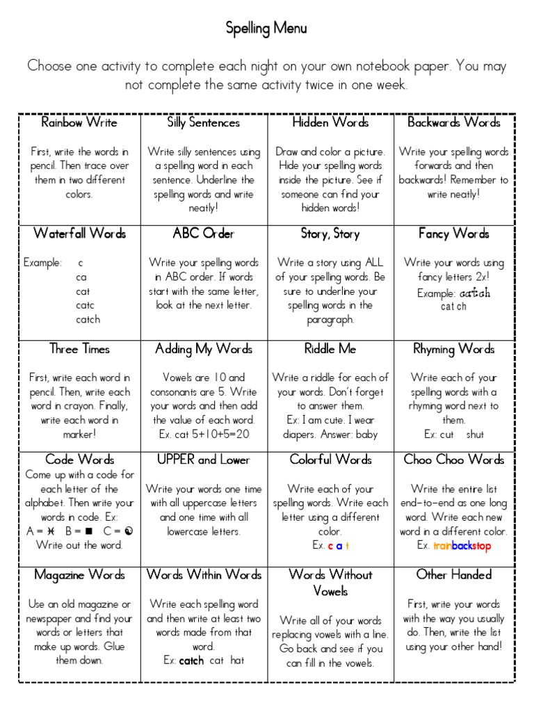 Example: c Write your spelling words Write a story using ALL Write your words using