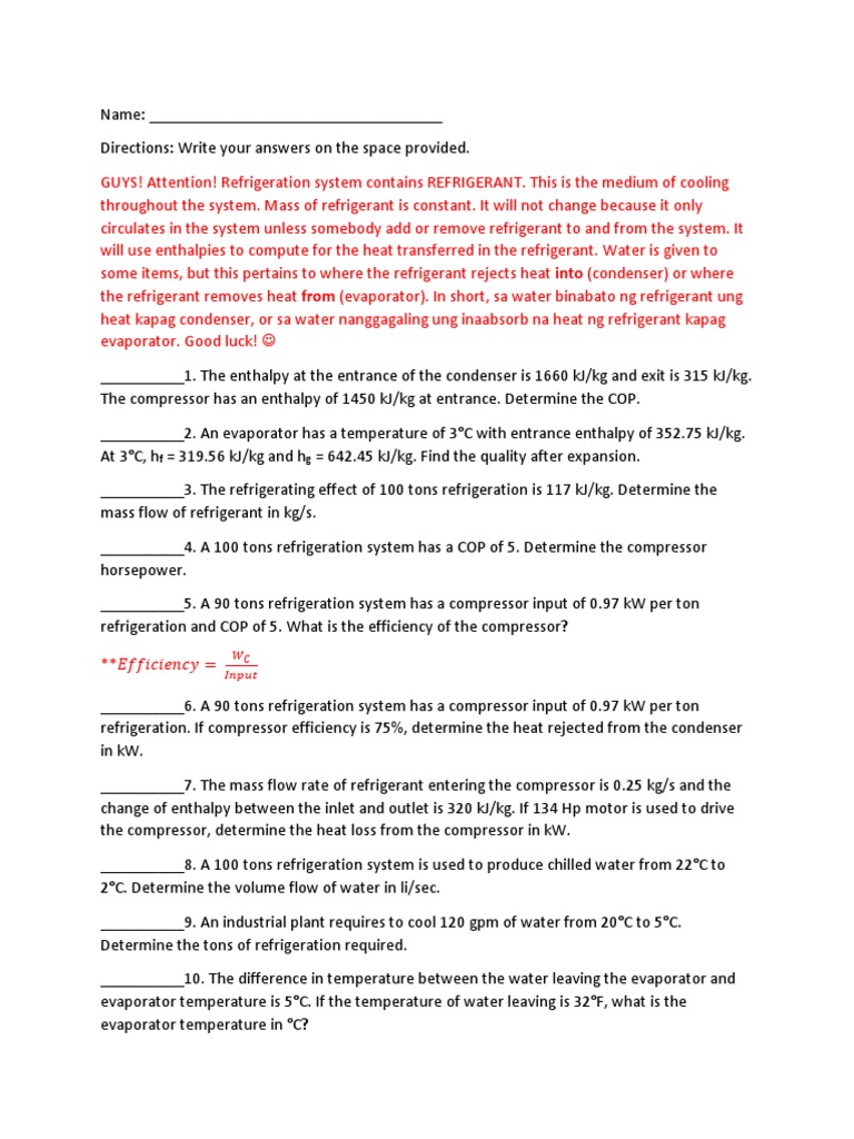 __________5. A 90 tons refrigeration system has a compressor input of 0.97 kW per ton