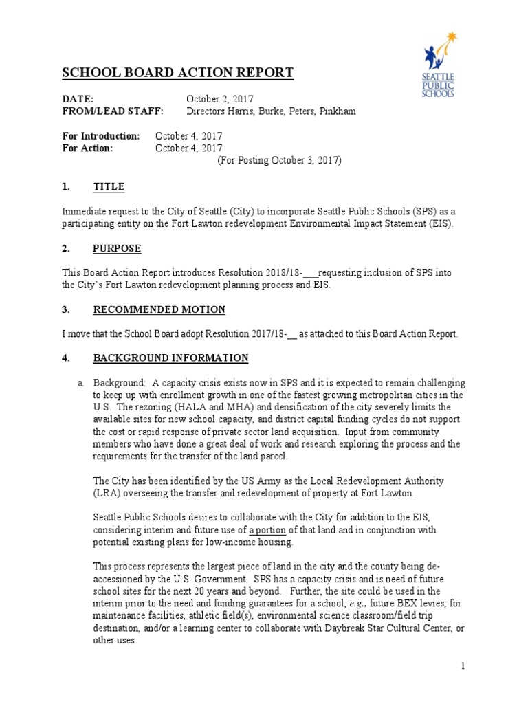 WHEREAS, Fort Lawton could serve as a viable location for a school or other school uses; and
